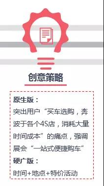 投放需求 投放主题:端午车展 投放地域:佛山&东莞 目标群体:展会举办城市有购车计划的人群 核心优势: 1. 大众车型&品牌齐全 2. 厂车合作,价格低 3. 便捷、一站式购车体验